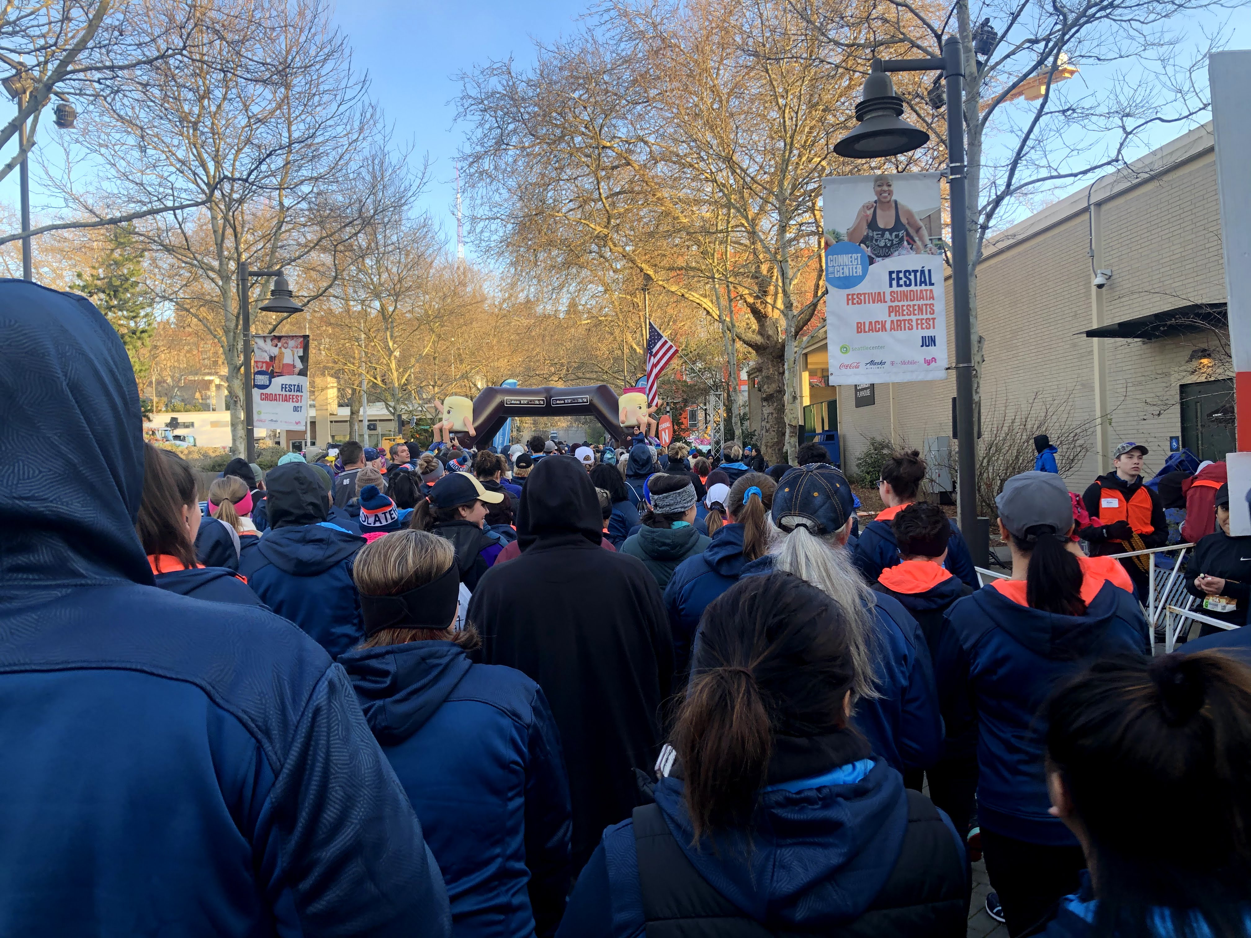 The race starts at a bit of a downhill. It begins at the Seattle Center and then heads north on Mercer for a bit. After the downhill, you are then met with a consistent uphill until the turnaround point. With my hip bursitis, I thought that I would be walking the entire race. After the first quarter mile, my hip felt fine so I thought a slow trot would be acceptable.