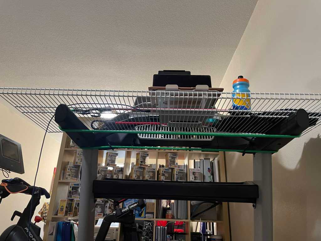 - Use the long bungee cords to secure the shelf to the top of the treadmill handlebars. Secure underneath the treadmill and around any other handlebars available. (In my case, the bungee cord could be threaded through the heart rate handles.)